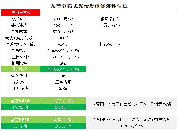 ★在户用方面,若基准收益率设为6%,经过测算(计算过程见附件),在无市级补贴的情况下,光伏发电项目的动态投资回收期为17.40年;在有市级补贴的情况下,光伏发电项目的动态投资回收期为10.80年。若无市级补贴,成本回收期较长。即使随着技术的提升,光伏板的价格会不断下降,但是逆变器的价格一直维持在高位,光伏设备的总投资不会有大幅度降低,因此,市级补贴对户用的光伏项目产生较为可观的经济效益。然而由于分布式光伏发电设备安装对场地的要求较高,随着东莞市城镇化进程的不断提高,可安装光伏设备的场地将越来越少;★在企业方面,若基准收益率设为6%,经过测算(计算过程见附件),无论有没有补贴,动态投资回收期约为7-8年,由此可知,政策补贴对企业投资项目的动态回收期影响不明显。