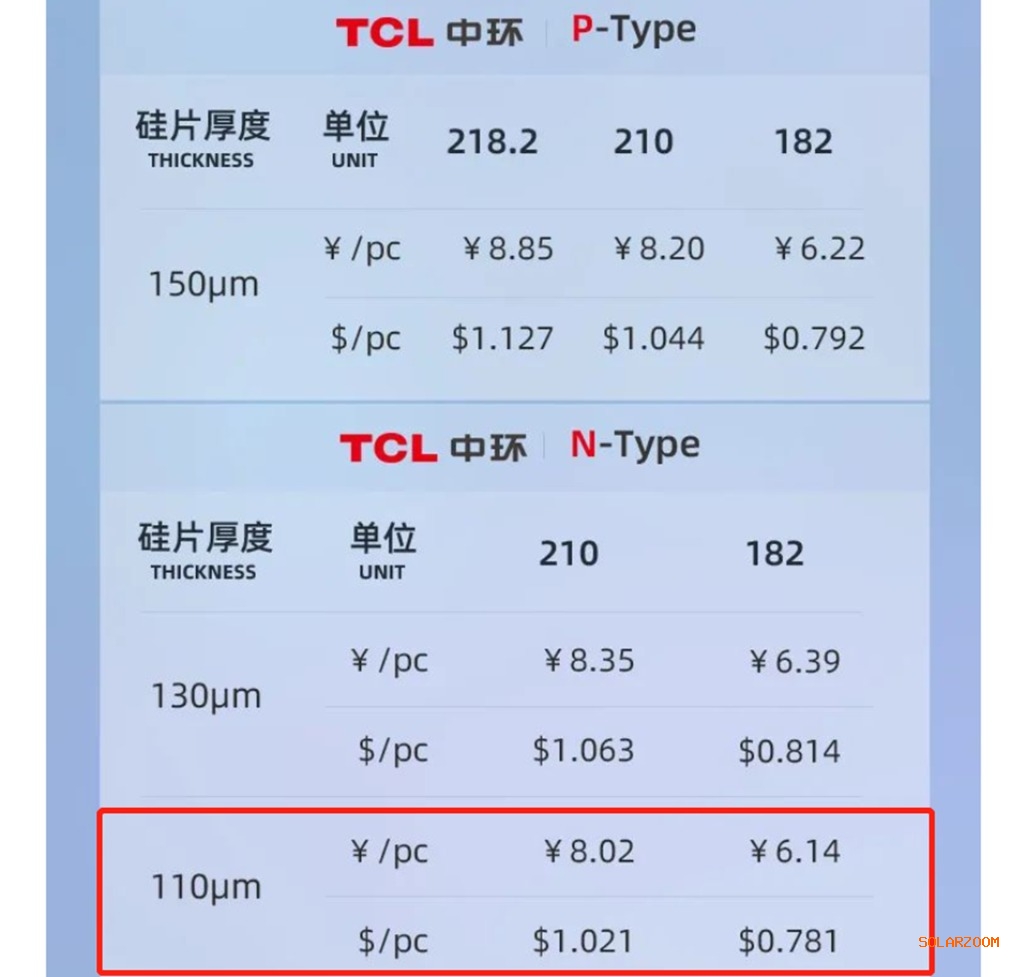 值得注意的是,这也是今年以来,TCL中环N型硅片第二次减薄——对比公司今年2月4日与去年12月23日发布的公示价,N型硅片中,150μm与130μm的两种厚度被140μm与130μm所取代。