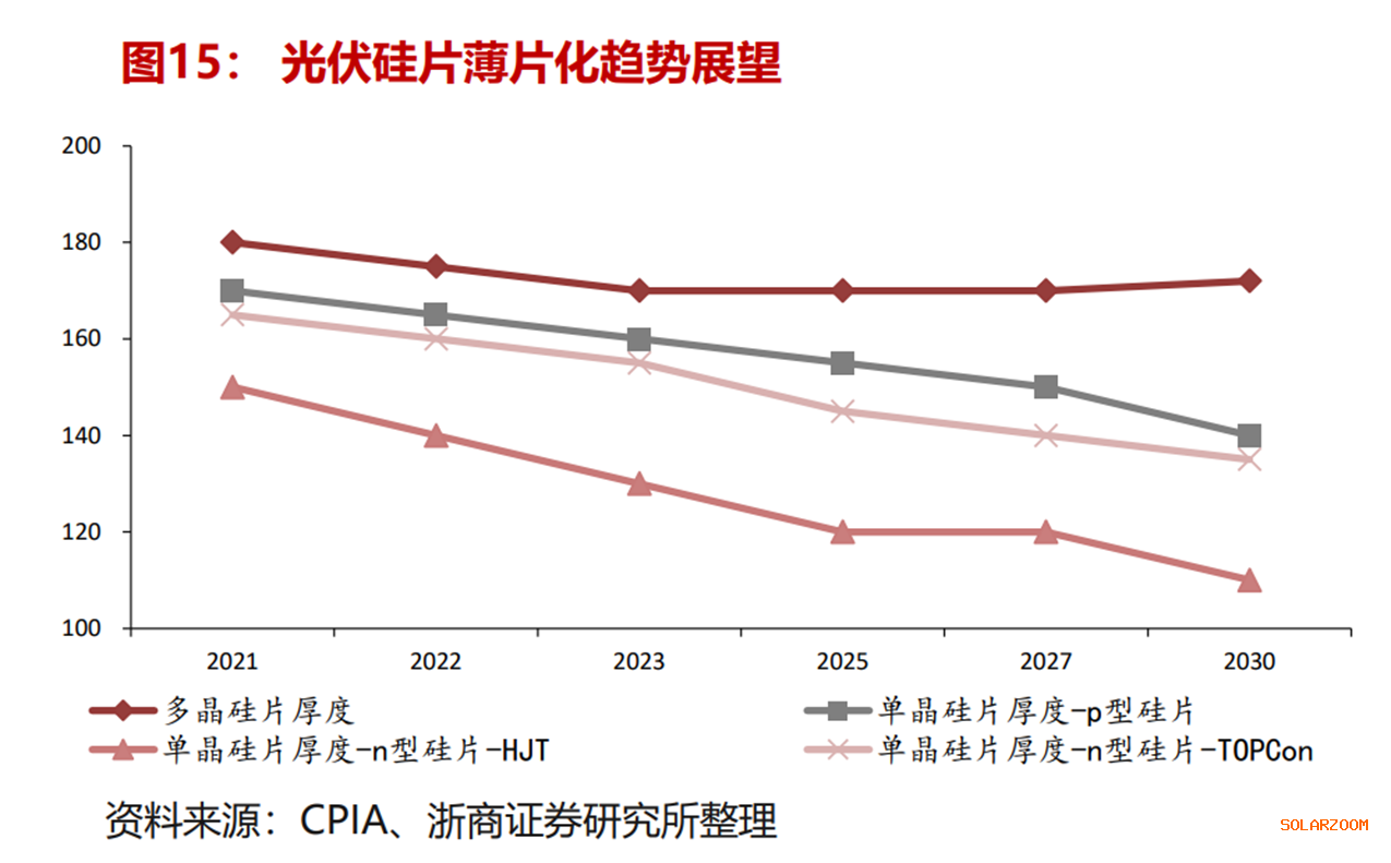 据薄片测试数据显示,硅片厚度从140μm减至100μm的过程中,电池效率维持稳定,可基本保持在25.2%左右。华泰证券测算称,硅片厚度每下降10μm,单瓦硅耗降低约0.1g/w,以硅料价格不含税100元/kg测算,硅片厚度每下降10μm,硅成本降低0.01元/w。