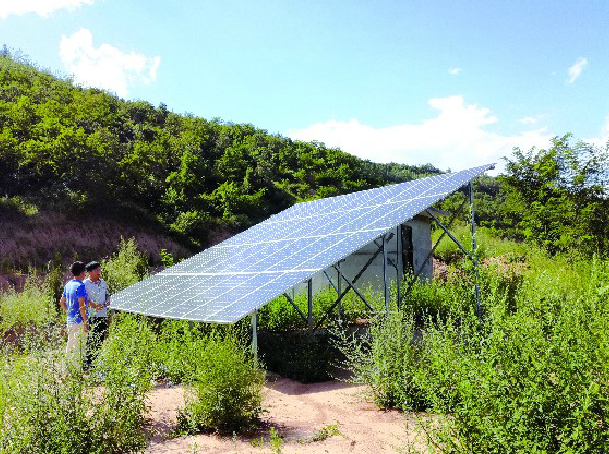 这座光伏水站建在九成宫镇桑树塬村。其外部结构相当简单,一块50平方米左右的光伏板负责发电,再加上一间不足10平方米的设备房。“看着简单,作用不简单。”该县林业工作站站长王永强说,附近山上有一处上百亩的生态扶贫核桃示范林,长势虽然不错,可时不时要为浇水发愁,尤其是在今年,降水量一直偏少。为此,他们经过多方考察、反复论证,修建了这个既节约资金又实用的光伏水站。他指着不远处的一条水沟说,通过太阳能发的电,从水沟里抽水上山,再用滴灌的方法将水送到每一棵核桃树下。“山上有一个蓄水装备,只要打开阀门,系统就可以自动启用,送水上山。操作很方便,只要有阳光就行。”