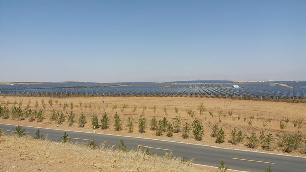 发展至今,园区占地11万亩,在现场记者看到,生态光伏利用“板上发电、板下种草、板间养羊”发展立体化产业模式,在发电供电的同时,实现防风治沙、改良土壤。库布其沙漠天日照时数3800小时以上,发电量充足,再加上国内先进的“双面发电”技术,发电量可提高20%以上;光伏板遮光挡风,减少沙漠土壤的水分蒸发,同时降低风速,形成了防风阻沙林带;发电板下,种植甘草类植物,利用其生物固氮作用,增加土壤肥力,经过长期改良,使荒漠变良田;发电板间,养殖牛羊,形成的天然生物肥反补种植。