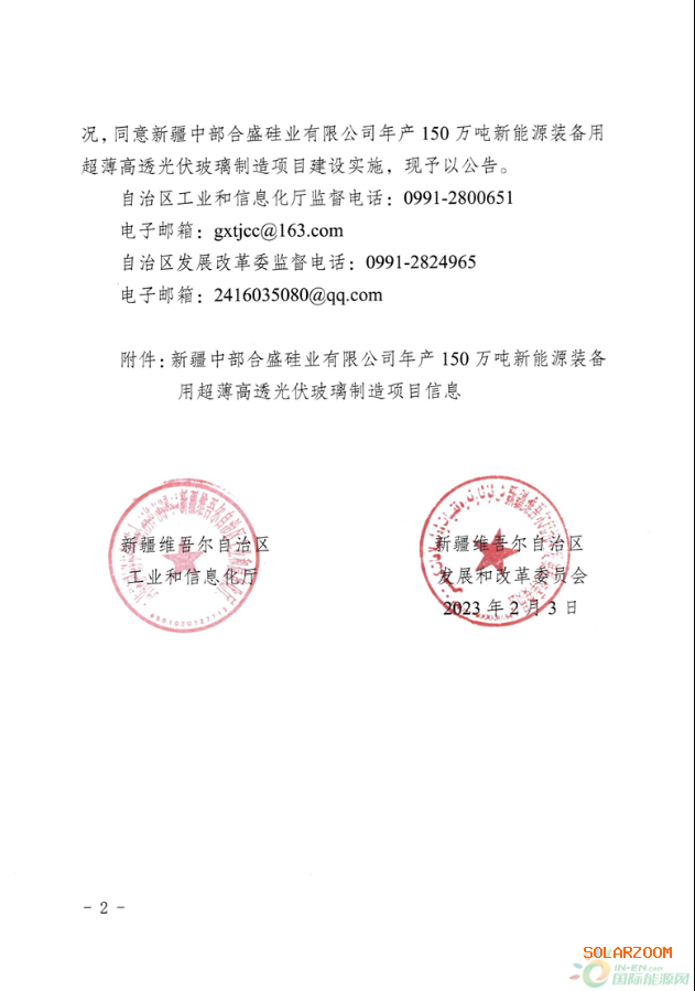 公告称,根据工业和信息化部和国家发展改革委风险预警意见,结合听证意见,新疆自治区工业和信息化厅、新疆自治区发展改革委于2023年1月9日至1月28 日,对新疆中部合盛硅业有限公司年产150万吨新能源装备用超薄高透光伏玻璃制造项目进行了公示,公示期间无异议。结合风险预警意见、听证意见及公示情况,同意新疆中部合盛硅业有限公司年产150万吨新能源装备用超薄高透光伏玻璃制造项目建设实施。