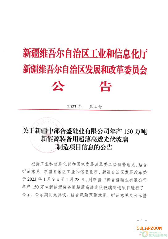 近日,新疆工信厅发布关于新疆中部合盛硅业有限公司年产150万吨新能源装备用超薄高透光伏玻璃制造项目信息的公告。