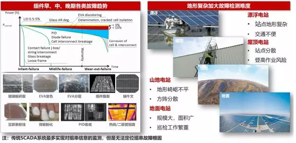 业界对光伏电站一般都采用抽检的方式来查处上述问题,但10MW电站,即使按照0.1%抽检率,也需要不菲的费用。而且由于抽检率低,对电站的评估不全面;其次,测试需要带上相应的测试设备,把组串拆下来,效率比较低。此外当前普遍采用比较输出功率、开路电压、短路电流、工作电压、工作电流大小的方法识别组件故障,故障识别率低且容易导致误判。总的来说,传统的巡检方式费时费力、效率低成本高,给业主的精细化运维带来了非常大的困难。而且光伏电站场景非常复杂,除了平坦的陆地外,在山地、屋顶、水面上皆有应用,从而导致上站非常困难,检测成本非常高等现实问题。