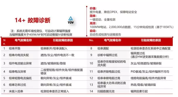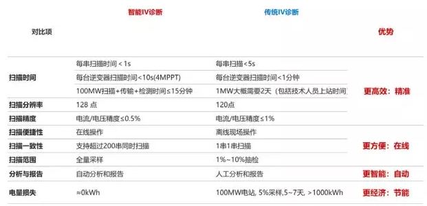 根据黄河水电发布的资料:通过智能光伏管理系统和智能光伏控制器,可以在线、全量高精度检测每个组串,并达到专业户外IV测试仪器精度;完成一个子阵的扫描、数据分析及故障报告生成仅需约10-15分钟,无需专业人员和设备上站,一键式远程操作,大量节省了检测强度,降低了电站对测试人员的需求以及测试成本;组串内部的组件故障,通过组串智能诊断实现预警,同时可进行电站健康状况的综合评估,实现问题的主动发现和预防性维护。该技术诊断精度和诊断效果已经得到了TUV的认证,而且也是目前唯一获得TUV认证并且具有大规模商用实践的技术。