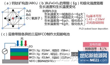 新型太阳能电池之所以能成功地大幅提高效率, 是因为采用BFCO减小了带隙值,可利用更多的太阳能。而且通过改变结晶生长的条件,可制作具备目标值带隙的材料。