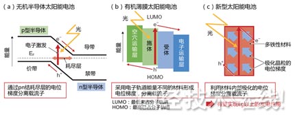 图为新型太阳能电池与现有太阳能电池的发电原理差异。不同的是,利用光激发的电子与空穴的成对载流子的分离方法。Si类太阳能电池等利用pn结分离载流子(a),而有机太阳能电池主要利用LUMO和HOMO各异的材料分离载流子(b)。染料敏化电池也(b)差不多是这样。而新型太阳能电池完全不利用pn结,是通过自发极化的内部电位梯度来分离载流子。这样,有望大大改变太阳能电池的发电性能严重受带隙限制的情况。