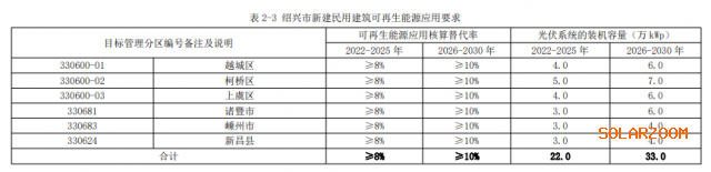 12月26日,绍兴市建设局公示《绍兴市绿色建筑专项规划(2022-2030)(草案)》,其中提到,新建民用建筑(农民自建住宅除外),应当按照国家和省有关标准利用可再生能源。可再生能源利用设施应当与建筑主体一体化设计,同步施工、同步验收。新建民用建筑应采用可再生能源系统,应配置太阳能系统,满足浙江省工程建设标准《民用建筑可再生能源应用核算标准》的要求。 至2025 年,绍兴市各县(市、区)新建民用建筑可再生能源应用核算替代率达到 8%,太阳能光伏系统的装机容量达到 22.0 万 kWp。至 2030 年,绍兴市各县(市、区)新建民用建筑可再生能源应用核算替代率达到 10%,太阳能光伏系统的装机容量达到 33.0万kWp。