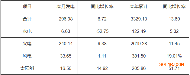 (一)发电量情况。12月份当月,全省发电量296.98亿千瓦时,同比增加6.72%。其中水电6.63亿千瓦时,同比减少52.75%;火电240.14亿千瓦时,同比增加9.38%;风电33.65亿千瓦时,同比增加1.11%;太阳能16.56亿千瓦时,同比增长44.92%。