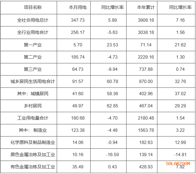 (一)全社会用电量情况。全省全社会用电量347.73亿千瓦时,同比增加5.89%;累计用电量3908.18亿千瓦时,同比增加7.16%。
