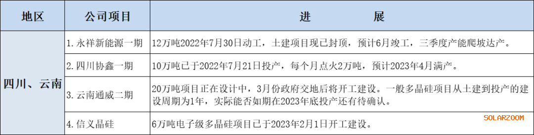 四川、云南地区多晶硅产能布局的最新进展请况: