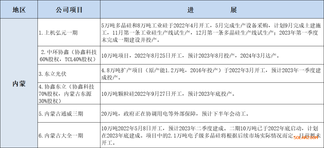 内蒙地区多晶硅产能布局的最新进展请况: