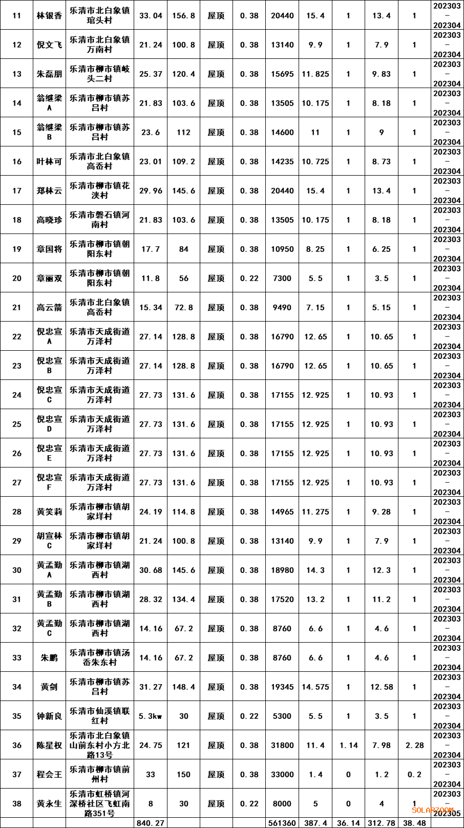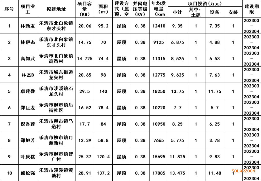 乐清市2023年第二批居民家庭屋顶分布式光伏发电项目表