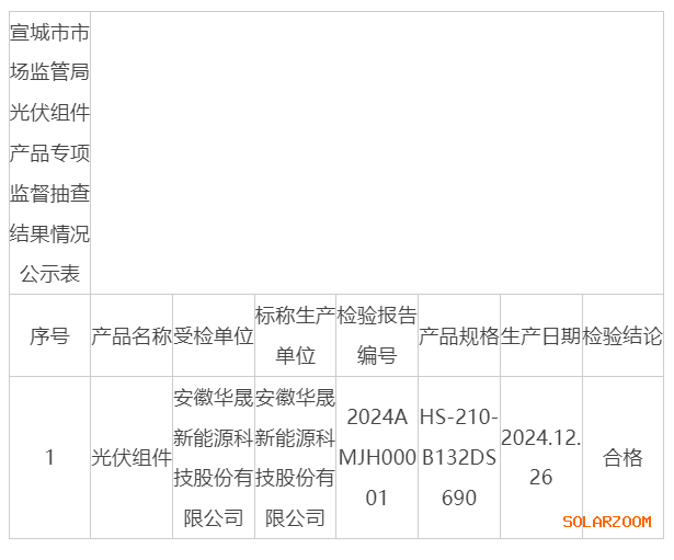 近日,安徽省宣城市市场监管局公示光伏组件产品专项监督抽查结果。