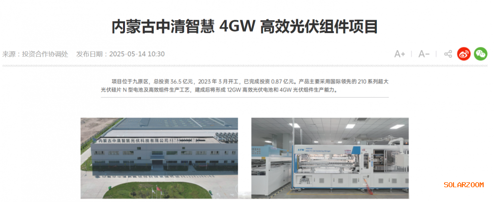 5月14日,内蒙古自治区商务厅发布内蒙古中清智慧 4GW 高效光伏组件项目相关信息。内蒙古中清智慧 4GW 高效光伏组件项目,位于包头市九原区,总投资36.5亿元,2023年3月开工,已完成投资 0.87亿元。