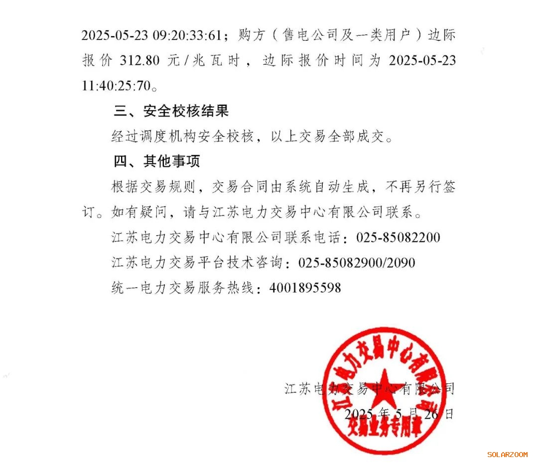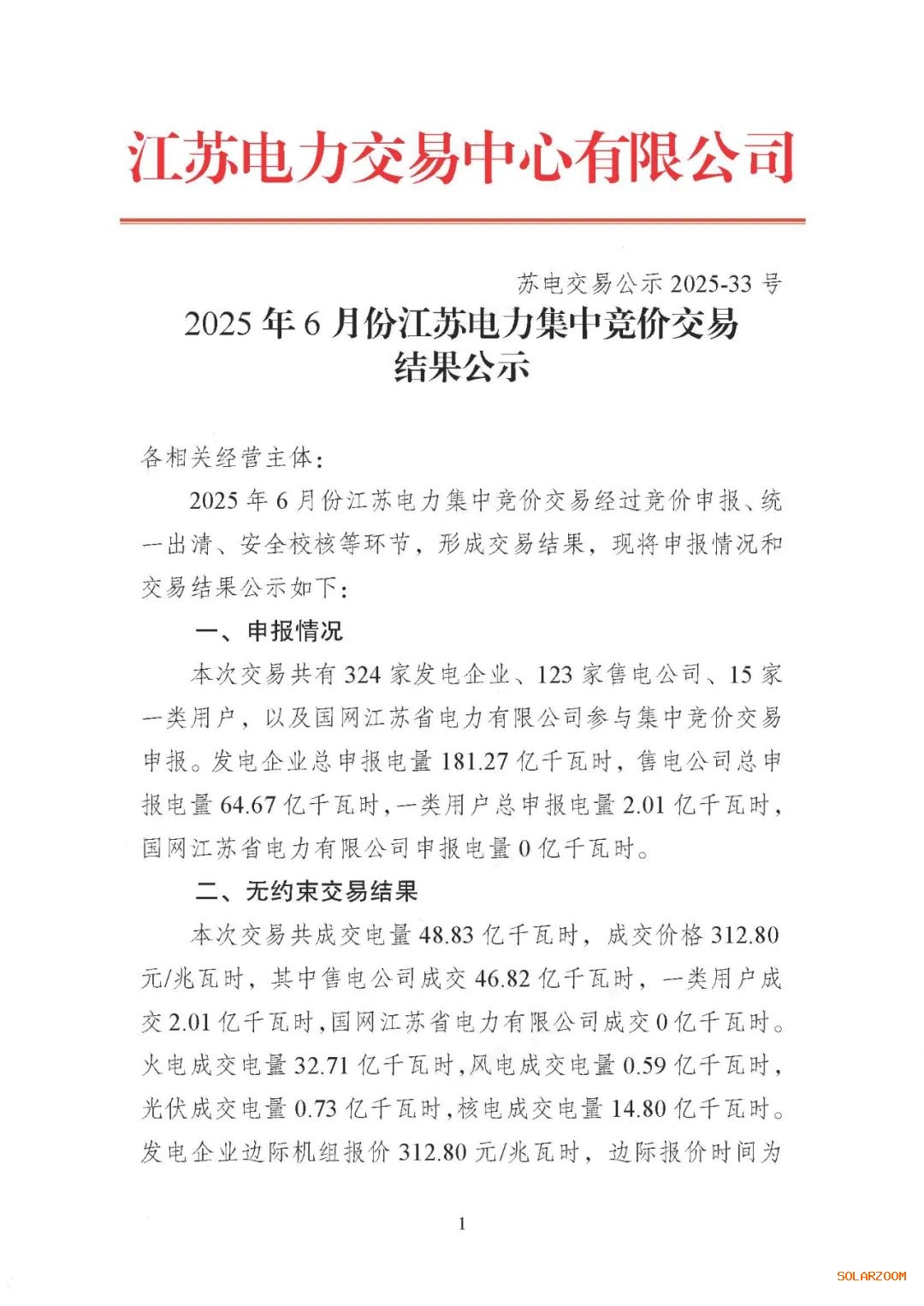 2025年5月26日,江苏省电力交易中心公布了6月份集中竞价的交易结果(详见附件):本次交易共成交48.83亿千瓦时,成交价格为312.8元/兆瓦时。该成交价与2025年5月相比,环比下降22%;与2024年6月相比,同比下降24%。