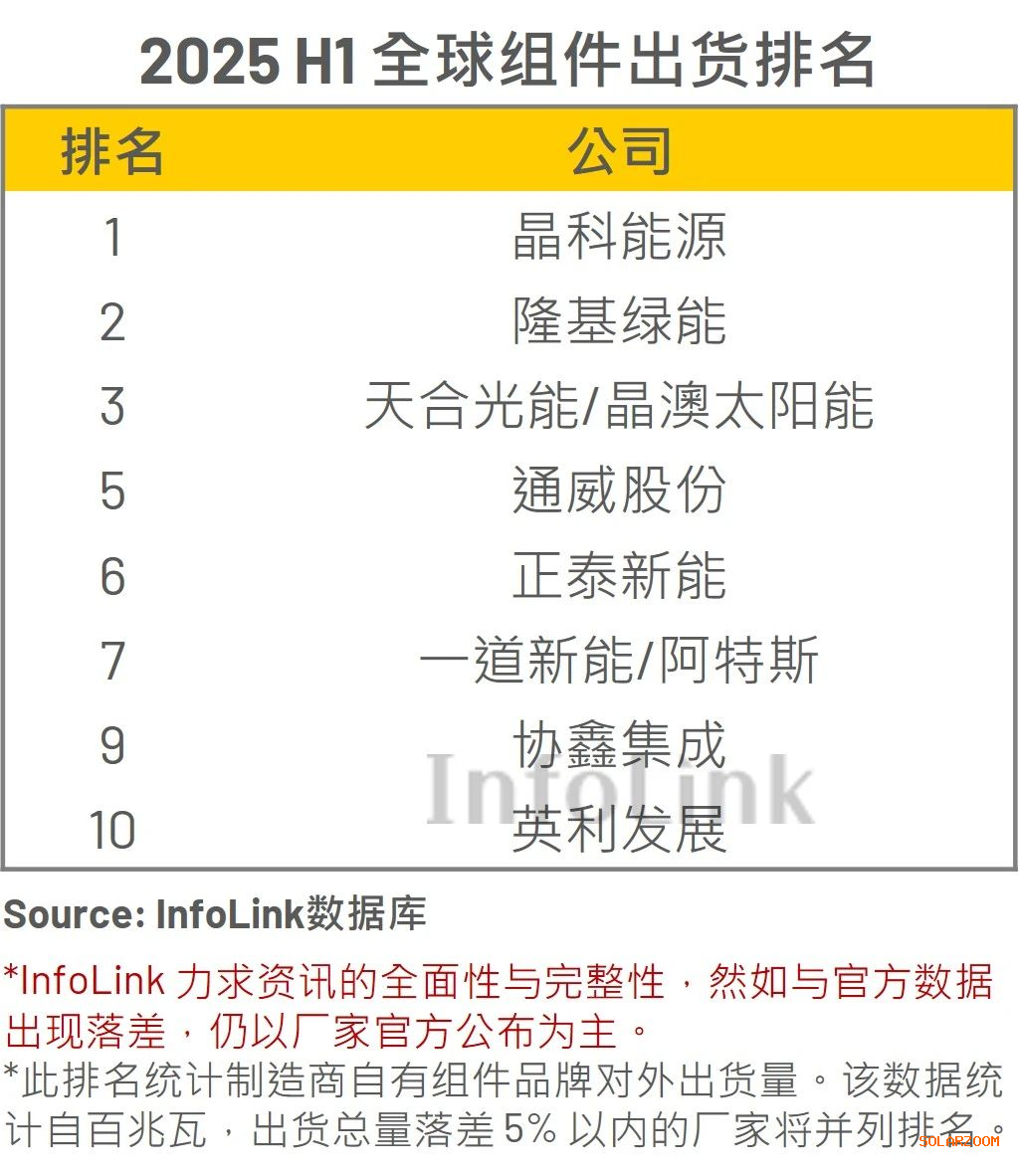 根据 InfoLink 的调研,2025 上半年全球前十大组件供货商总出货量约为 247.9 GW,环比去年同期增长 10%。