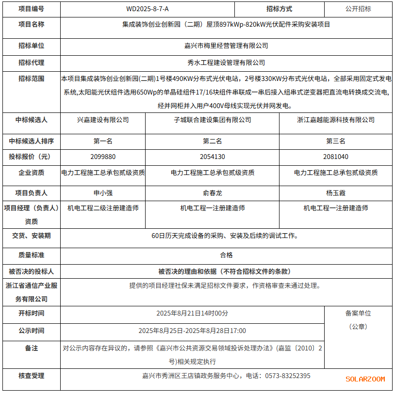 集成装饰创业创新园(二期)屋顶897kWp-820kW光伏配件采购安装项目中标公示[更正]