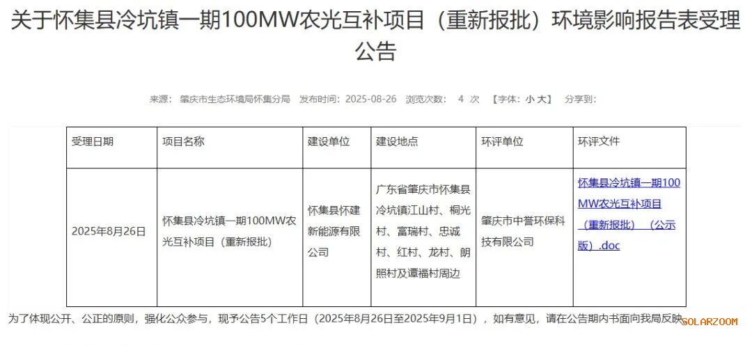 8月26日,广东省肇庆市生态环境局怀集分局发布了关于怀集县冷坑镇一期100MW农光互补项目(重新报批)环评受理的公示。