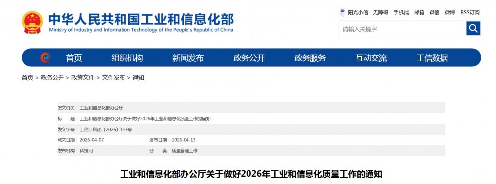 4月13日,工业和信息化部办公厅发布关于做好2026年工业和信息化质量工作的通知。