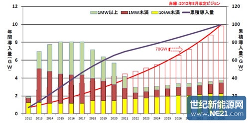 报告还提出了当累积设置量达到100GW后的下一个目标,是达到能满足全部家庭用电量的约260GW。若以每年6GW左右的设置速度持续,到2055年前后即可达成这一目标。之后是在100年后的2115年达到满足日本3成最终能源消耗的约700GW。