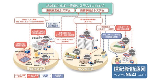 另外,预计新蛇田地区今后会对灾害公营住宅和独户住宅大量采用光伏发电。因此,导入了以蓄电池来调整光伏发电的输出变动,从而使电网稳定化的系统。据称,与东芝设置的需求方综合系统联动,可综合管理当地的能源。