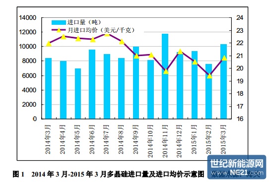 2015 年 3 月份从美国进口多晶硅量增加至 1572 吨,环比增幅为 8.0%;3月份进口单价微幅上调至 19.94 美元/千克,环比涨幅为 25.4%。