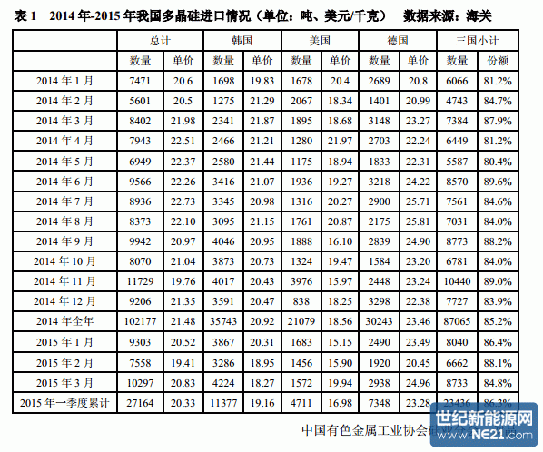 根据海关数据统计,2015 年 3 月份我国多晶硅进口量为 10297 吨,环比大幅增加 36.2%。一季度累计进口多晶硅 27164 吨,同比增加 26.5%。有色协会硅业分会认为,致使 2015 年 3 月份多晶硅进口量大幅增加至过万的主要原因有:第一,3 月份自韩国进口量 4224 吨,环比大幅增加28.5%,在总进口量中占比依旧高达 41.0%,连续十一个月位居进口量首位,一季度累计自韩国进口 11377 吨,在总进口量中占比为 41.9%。从韩国进口量一直居高不下是导致总进口量大幅增加的主要原因;第二,3 月份自美国按加工贸易方式进口多晶硅量为 1530 吨,占当月自美国进口总量的 97.3%,一季度累计自美国按加工贸易方式进口占比达 95.7%,几乎全部通过加工贸易方式进入。