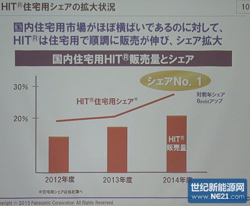 松下宣布了将对日本两座生产太阳能电池的工厂合计投资95亿日元以增强产能的消息。增强产能的背景是日本国内的业务环境发展良好。在以2GW左右的速度增长的日本住宅用太阳能电池市场上,松下的份额逐渐扩大,到2014年度已拥有了约3成的市场份额,位居榜首。