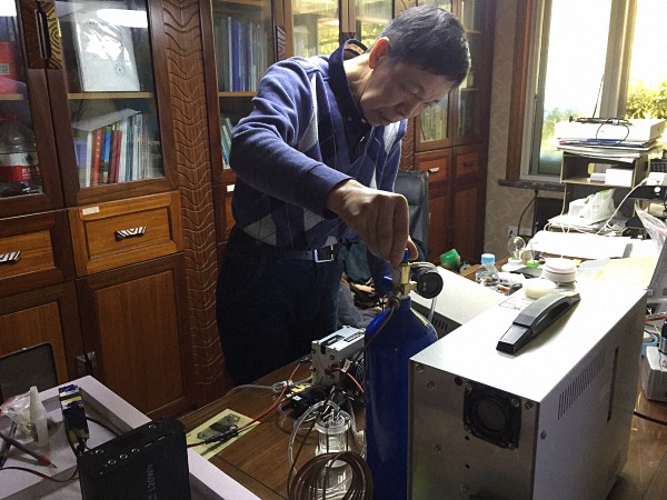 赵春江在家打开储氢罐阀门,进行“家庭PV发电、储电、供电系统”实验。