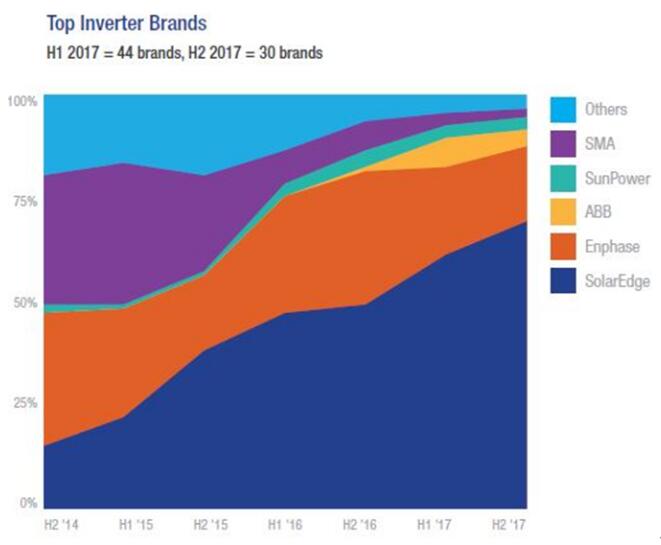 这张图表显示SolarEdge公司已成为住宅太阳能发电设备的主导品牌。从其尺寸和复杂性来考虑,其安装量的增加可能直接归因于来自SolarEdge公司和公司Enphase的模块级电子器件。
