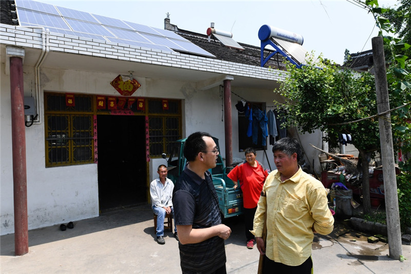 在泰兴市元竹镇大元村村民丁兴华家,“第一书记”叶正富(前左)在向丁兴华(前右)了解光伏发电收入情况(6月12日摄)。