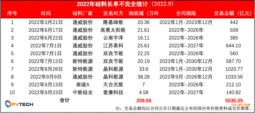 2021-2022协鑫科技硅料长单不完全统计,PV Tech