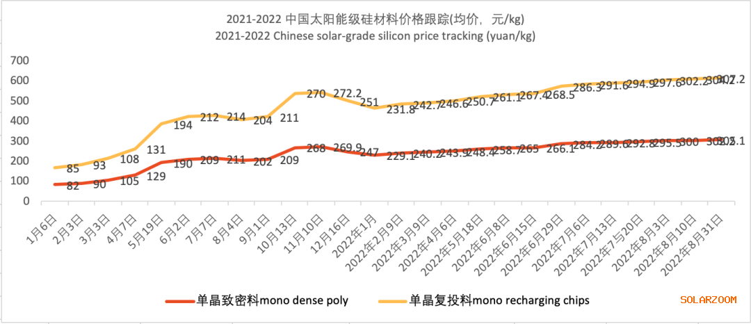 此外,今年持续高温天气导致多地电力供应不足,四川、江苏等地出现临时限电情况,影响了部分企业开工率。据硅业分会报道,8月份原本已有5家硅料企业检修,加上限电影响,供应紧缺程度并未缓解;9月多晶硅供应增量将在一定程度上缓解当前供应紧缺的局面,但与下游需求相比,仍有小幅缺口,短期内仍将支撑价格维持相对平稳走势。