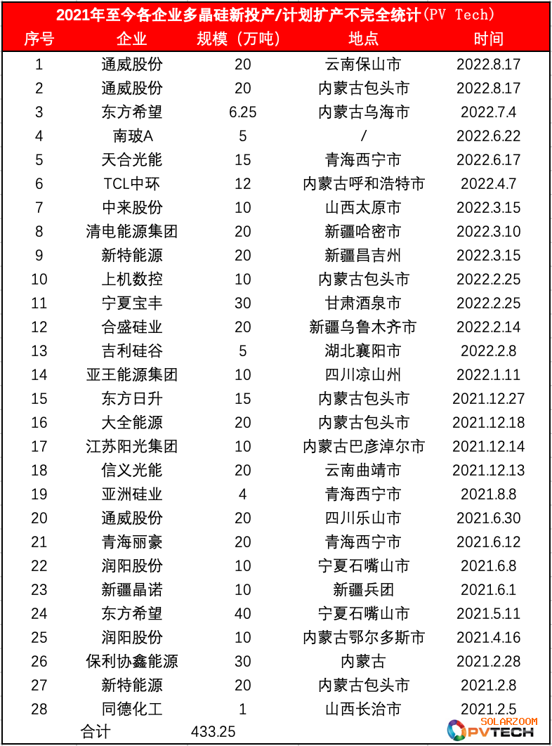 2021年至今各企业多晶硅新投产/计划扩产不完全汇总(PV Tech)