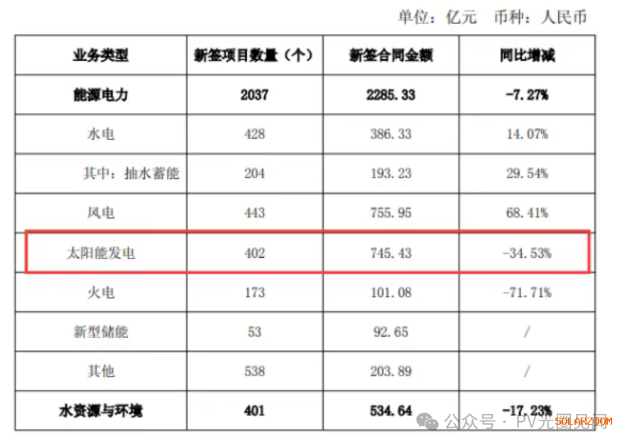 其中,风电业务表现亮眼,新签项目443个,合同金额755.95亿元,同比大幅增长68.41%;光伏业务新签项目402个,合同金额745.43亿元,同比下降34.53%。当前,风电产业受益于技术成熟与政策支持加速扩张,而光伏产业则受产业链价格下行和市场竞争加剧的影响正处于调整阶段。