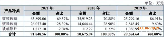 招股书显示,索拉特的产品涵盖光伏的主要组件。主要产品包括镀膜玻璃、镀釉玻璃及玻璃原片。其中占比最大的是镀膜玻璃。2021年,镀膜玻璃实现销售收入6.38亿元,占比达69.57%。