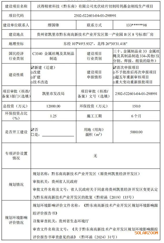 根据公示信息,沃得精密科技(黔东南)有限公司光伏硅片切割用钨基金刚线生产项目,位于贵州省凯里市黔东南高新技术产业开发区第一产业园 B 区 8 号标准厂房,厂房占地面积约 5000 平方米,共 4 层,总建筑面积约 20000 平方米,其中一、二层为本项目生产用房,主要建设产能 2000 万公里金刚线母线-钨丝生产线。项目总投资12000 万元。
