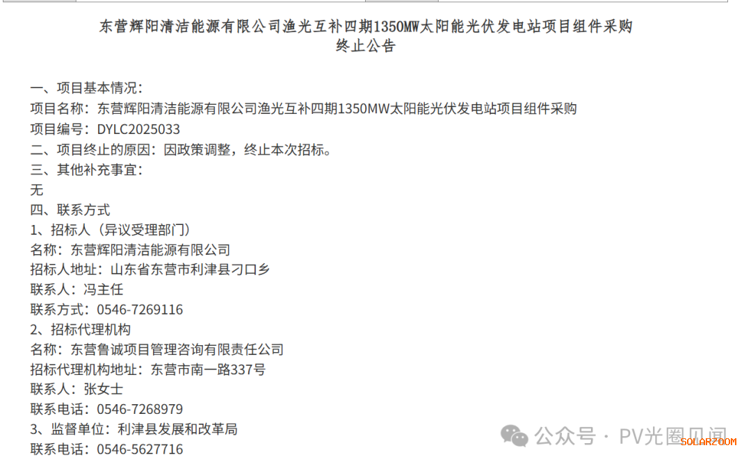 日前,东营辉阳清洁能源有限公司渔光互补四期1350MW太阳能光伏发电站项目组件采购宣布终止,终止原因为政策调整。