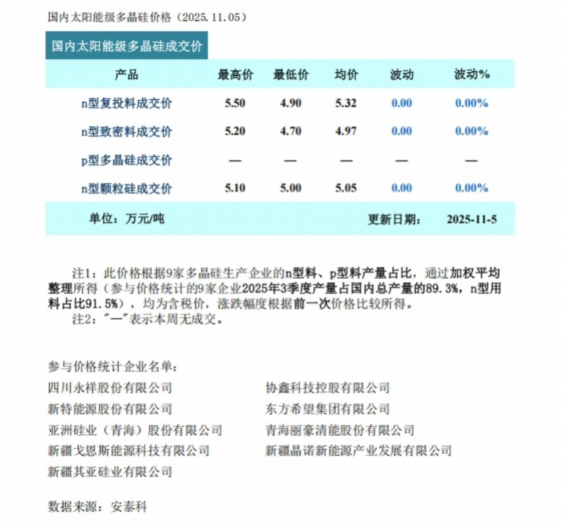 “展望多晶硅后续价格走势,仍将锚定于产能出清效率、边际成本曲线变动及供需再平衡节奏等多重变量的动态演绎。”通威股份在近日业绩会上指出。根据第三方市场分析机构安泰科2025年11月5日最新统计数据,多晶硅企业N型复投料成交价格4.9万元/吨-5.5万元/吨,环比基本持平。