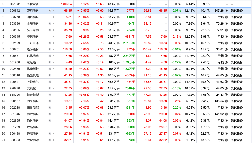 光伏板块持续上涨!截至11月10日收盘,光伏板块持续上涨,其中,国晟科技(603778.SH)、兆新股份(002256.SZ)等多只个股涨停,亿晶光电(600537.SH)、通威股份(600438.SH)等多只个股上涨。