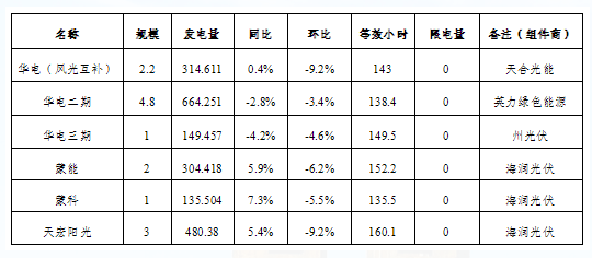 2019年7月份,我市光伏发电量2048.621万千瓦时,同比增长1.3%,环比下降6.4%,等效发电小时约146.3小时。其中,华电风光互补电场2.2万千瓦光伏发电场发电量为314.611万千瓦时,等效发电小时约为143小时。华电二期4.8万千瓦光伏发电场发电量为664.251万千瓦时,等效发电小时约为138.4小时。华电三期1万千瓦光伏发电场发电量为149.457万千瓦时,等效发电小时约为149.5小时。蒙能新能源2万千瓦光伏发电场发电量为304.418万千瓦时,等效发电小时152.2小时。蒙科金太阳1万千瓦光伏发电场发电量为135.504万千瓦时,等效发电小时135.5小时。天宏阳光3万千瓦光伏发电场发电量为480.38万千瓦时,等效发电小时160.1小时,为我市7月份光伏等效利用小时数最高。