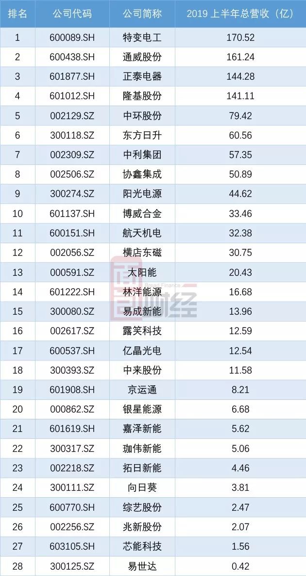 从单家的数据来看,上半年营业总收入最高的为特变电工(600089.SH),总金额约529.56亿元;其次为通威股份、正泰电器和隆基股份。以下为28家企业2019上半年营收排名情况: