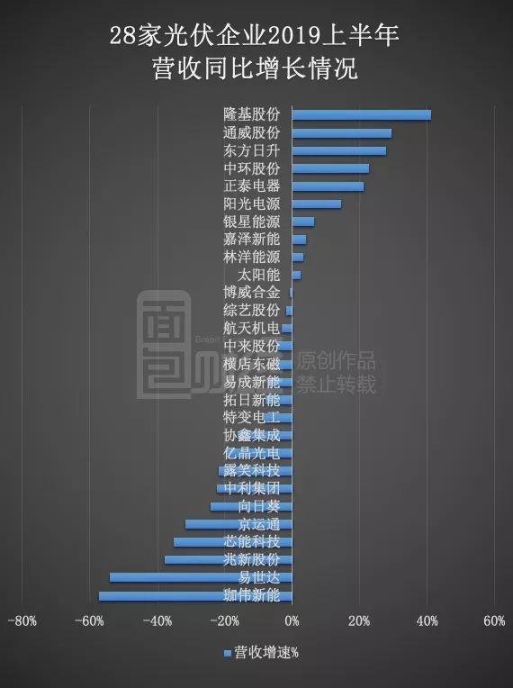 从营收增速来看,28家企业中有18家企业营收同比出现负增长,比例约达65%;其中2家企业营收腰斩。5家企业营收增速超过了20%,隆基股份(601012.SH)以41.09%的增速排在首位,其次为通威股份、东方日升(300118,股吧)、中环股份(002129,股吧)和正泰电器。以下为28家企业2019上半年营收增速情况: