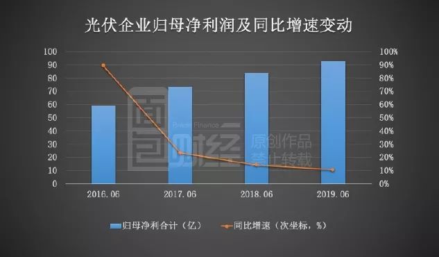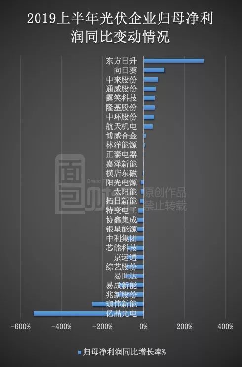 从归母净利润的同比增速来看,2019上半年增长最快的企业为东方日升,同比增长约295.52%。此外,利润翻倍增长的企业还有向日葵(300111,股吧)(300111.SZ),增幅约101.65%。
