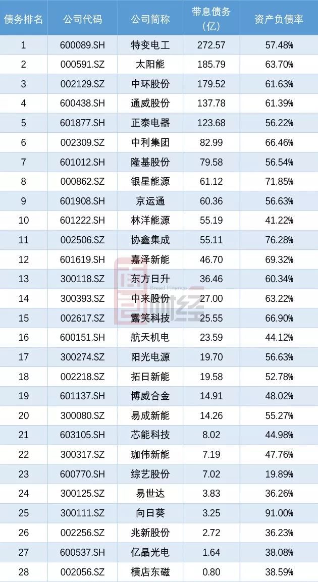 从单家企业来看,截止2019上半年光伏企业中带息债务规模最大的是特变电工,约超过270亿。除特变电工外,带息债务超百亿的企业还有太阳能(000591,股吧)、中环股份、通威股份和正泰电器。截止2019年6月30日,28家企业中资产负债率超过50%的企业有18家,占比超过64%。其中,资产负债率最高的是向日葵(300111.SZ),约达91%。以下为截止2019上半年28家企业带息债务及资产负债率具体情况: