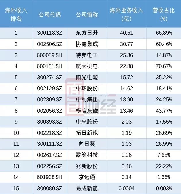 15家公司中,2019上半年海外业务收入最高的是东方日升(300118.SZ),约40.51亿。海外业务营收占比超过50%的公司有3家,其中比例最高的是航天机电(600151,股吧)(600151.SH),占比超过7成;其次为东方日升和协鑫集成(002506,股吧)。以下为15家企业2019上半年海外业务收入及占比情况: