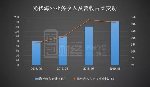 2018上半年,光伏海外收入的同比增速及营收占比达到近年最高,分别约33.98%和33.01%;2019上半年则有所回落,增速同比下降20.14个百分点,营收占比同比减少1.62个百分点。