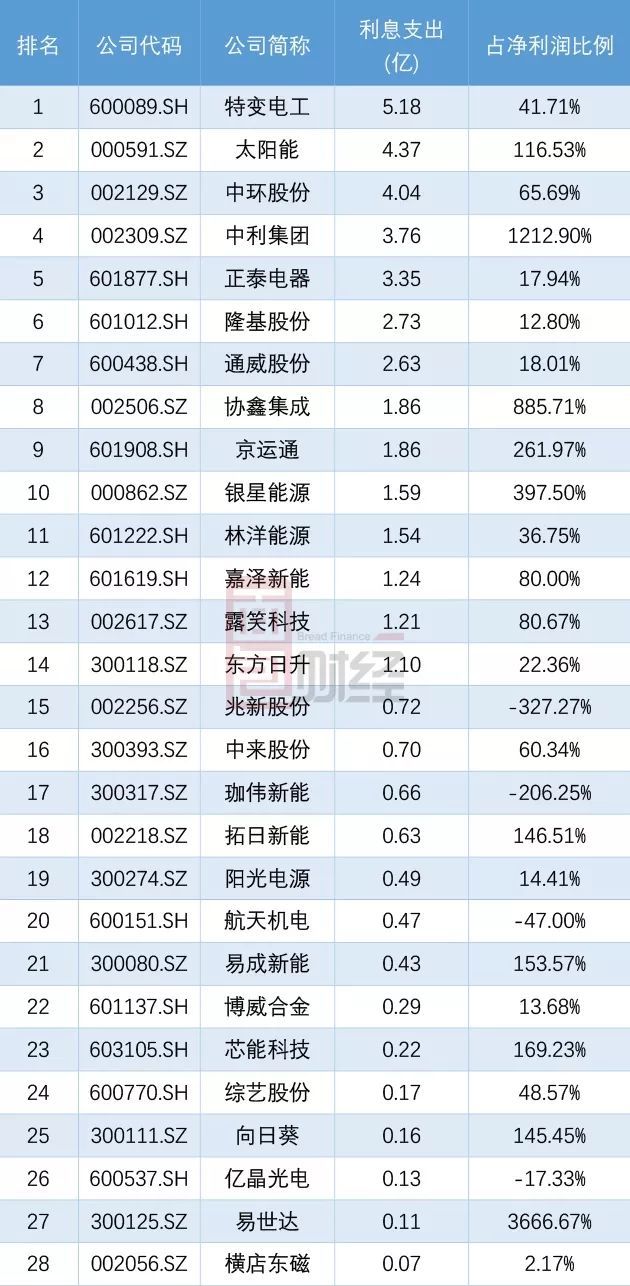 28家企业2019上半年发生的利息支出合计约41.71亿,同比增长约14.75%。其中特变电工以5.18亿元排在首位。上半年利息支出超过1亿的企业有14家,占比5成。利息支出超过同期净利润的企业有10家,占比约35.7%。以下为28家企业2019上半年利息支出与利息支出占同期净利润比例情况: