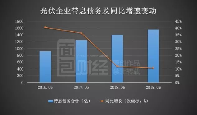 截止2019年6月30日,28家企业带息债务规模合计约1555.91亿,较去年同期增长10.73%,增速持续放缓。下图为近四年光伏企业带息债务规模走势: